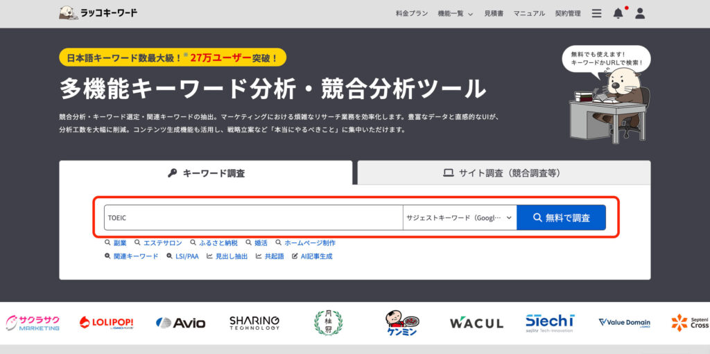 まずは「ラッコキーワード」のライトプラン(月額でOK!)に登録し、興味のあるキーワードを入力してサジェストキーワード(おすすめのキーワード)を検索します。