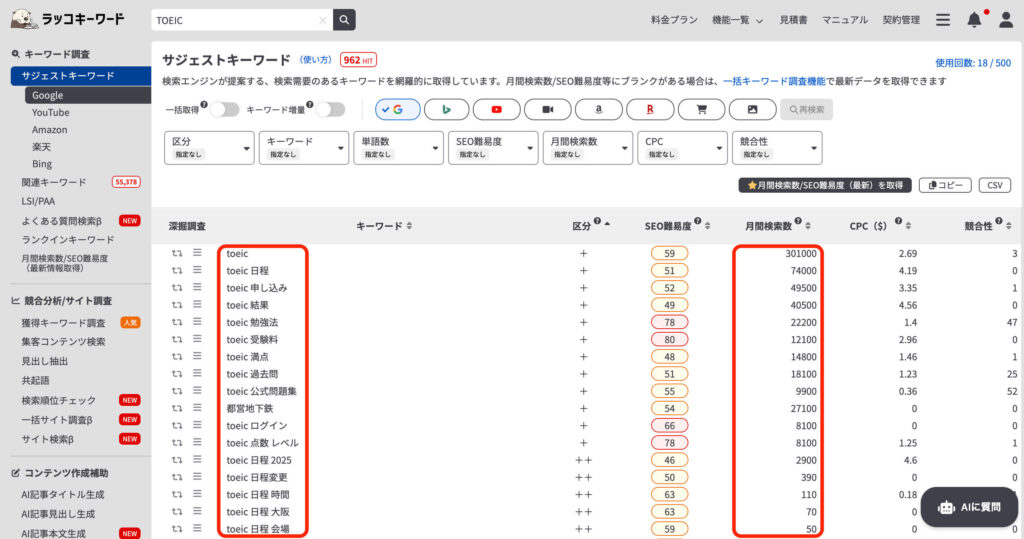 すると「TOEIC」を含んだサジェストキーワード・月間検索数が表示されます。