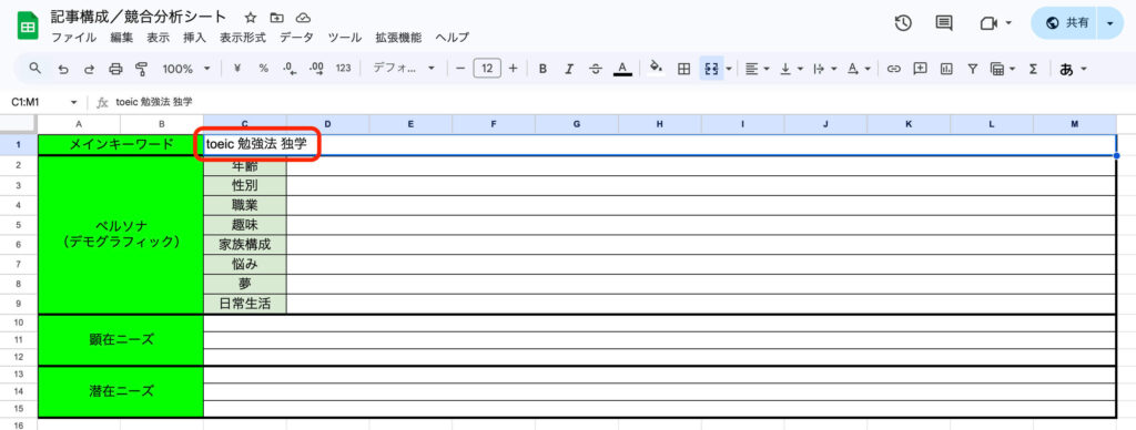 選んだキーワードを、記事構成シートの「メインキーワード」に入力しておきましょう。