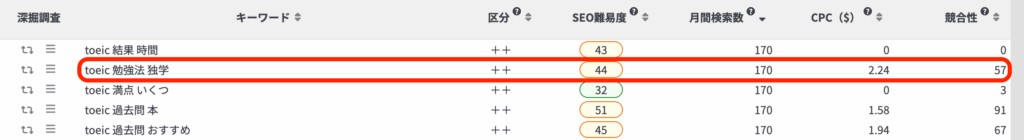 私は「toeic 勉強法 独学」というロングテールキーワードを選びました。