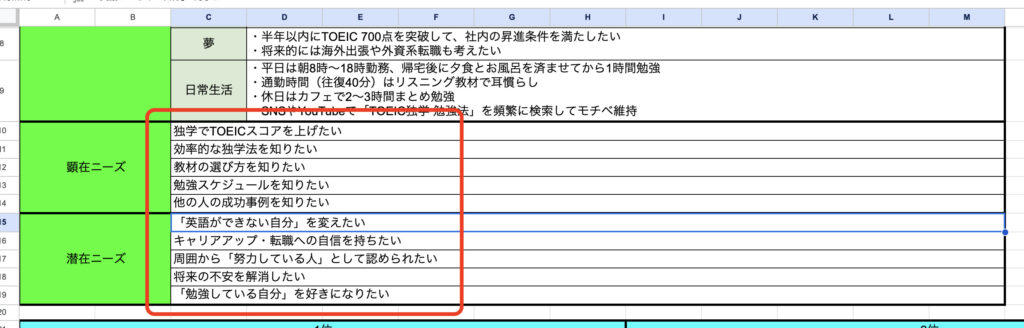 「toeic 勉強法 独学」のペルソナの場合、次のようなニーズが考えられます。