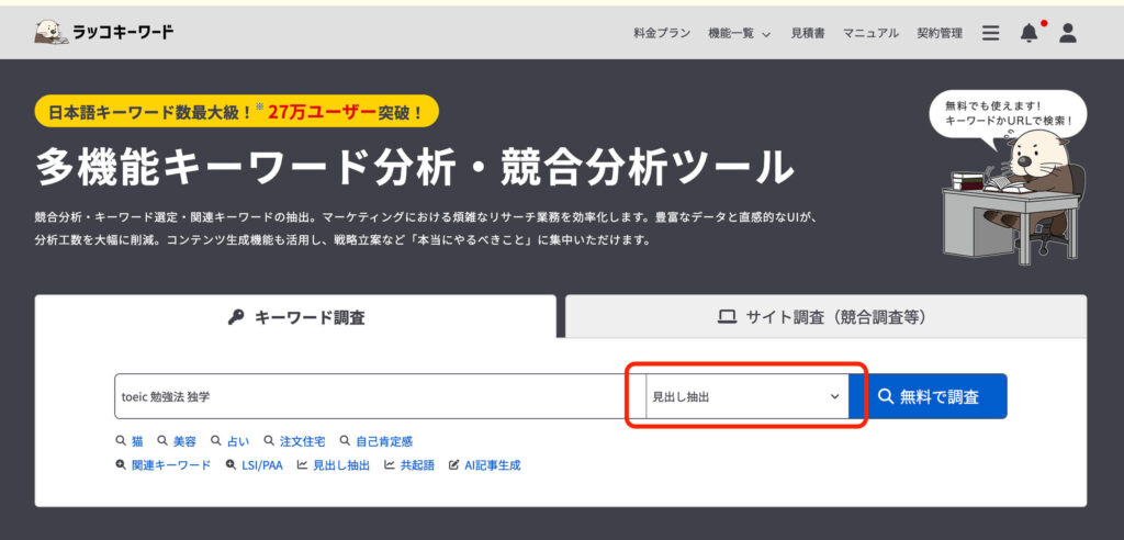 キーワードを入力し、「見出し抽出」を選択して調査を開始します。