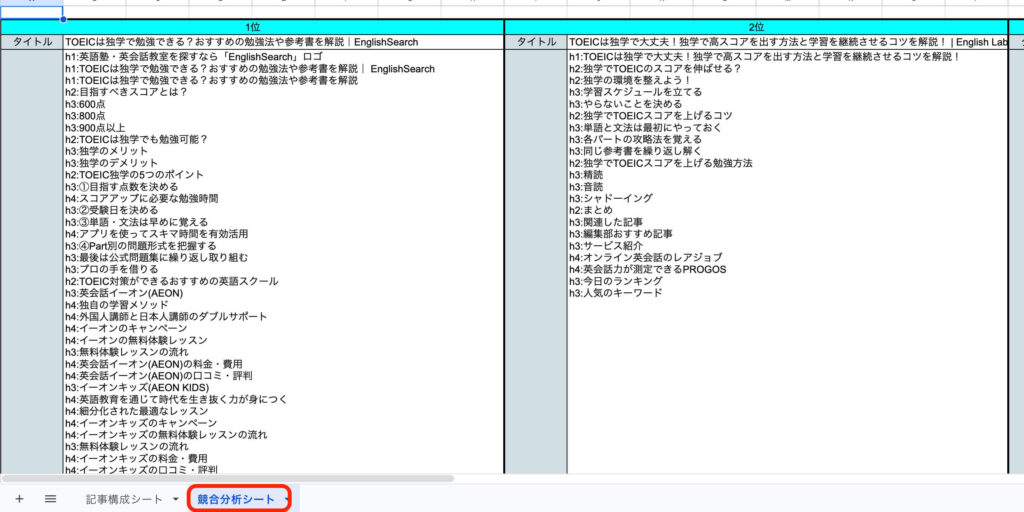 これの上位5記事のタイトルと見出し構成を、シートの「競合分析シート」に貼り付けましょう!