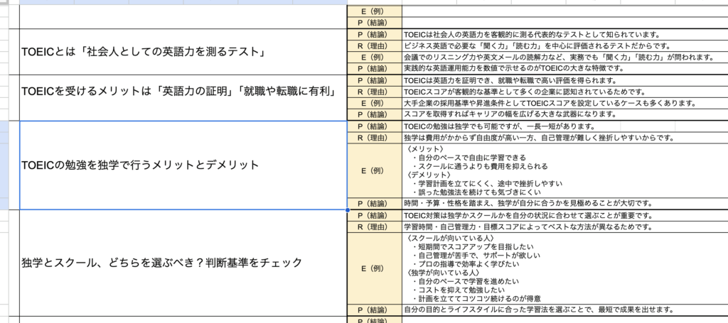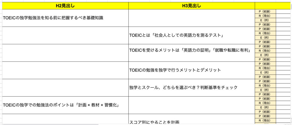 各h3で書く内容を、PREP法でざっくり書いていきましょう。