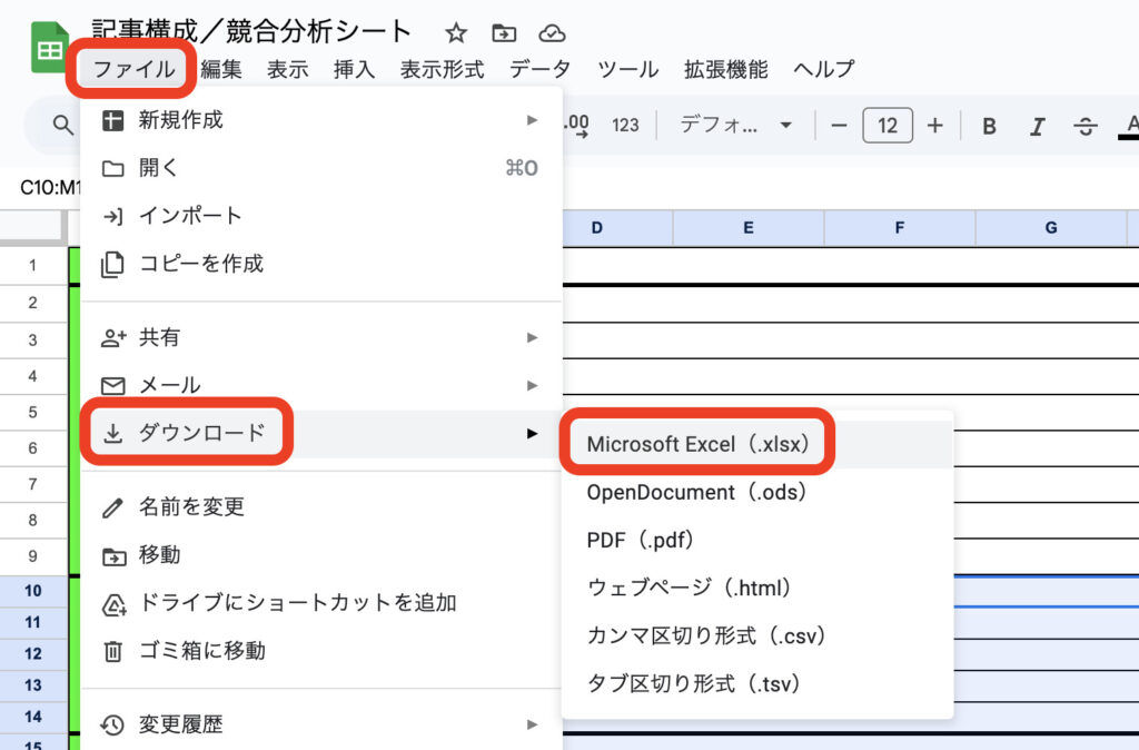 事前に「記事構成/競合分析シート」をマイドライブにコピーするか、Excelデータとしてダウンロードをしておいてください。